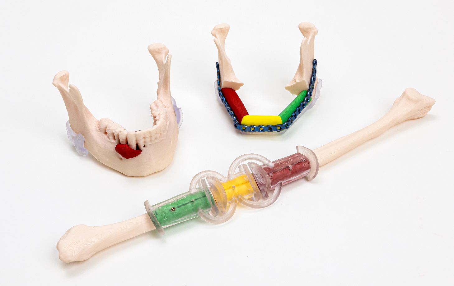 Vi printer guides til både kæben og fibula (lægbenet), så de udskårne stykker passer sammen. En samleguide og en model gør, at pladen kan bukkes på forhånd. Det giver en mere nøjagtig rekonstruktion, kortere tid under bedøvelse og bedre mulighed for at bevare blodforsyningen til det nye kæbestykke.