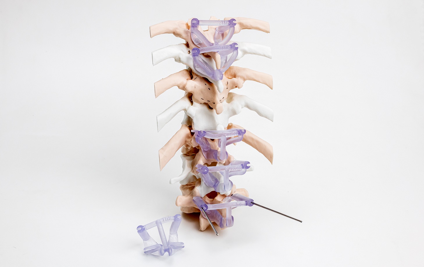Ved rygkirurgi for fx skoliose bruger vi pedikelguider til at placere K-tråde (styretråde) præcist, så pedikelskruer kan sættes sikkert. Placeringen planlægges på patientens CT. For hver hvirvel designes et par guider, der passer kun til den pågældende hvirvel og angiver den korrekte indstiksretning på begge sider.