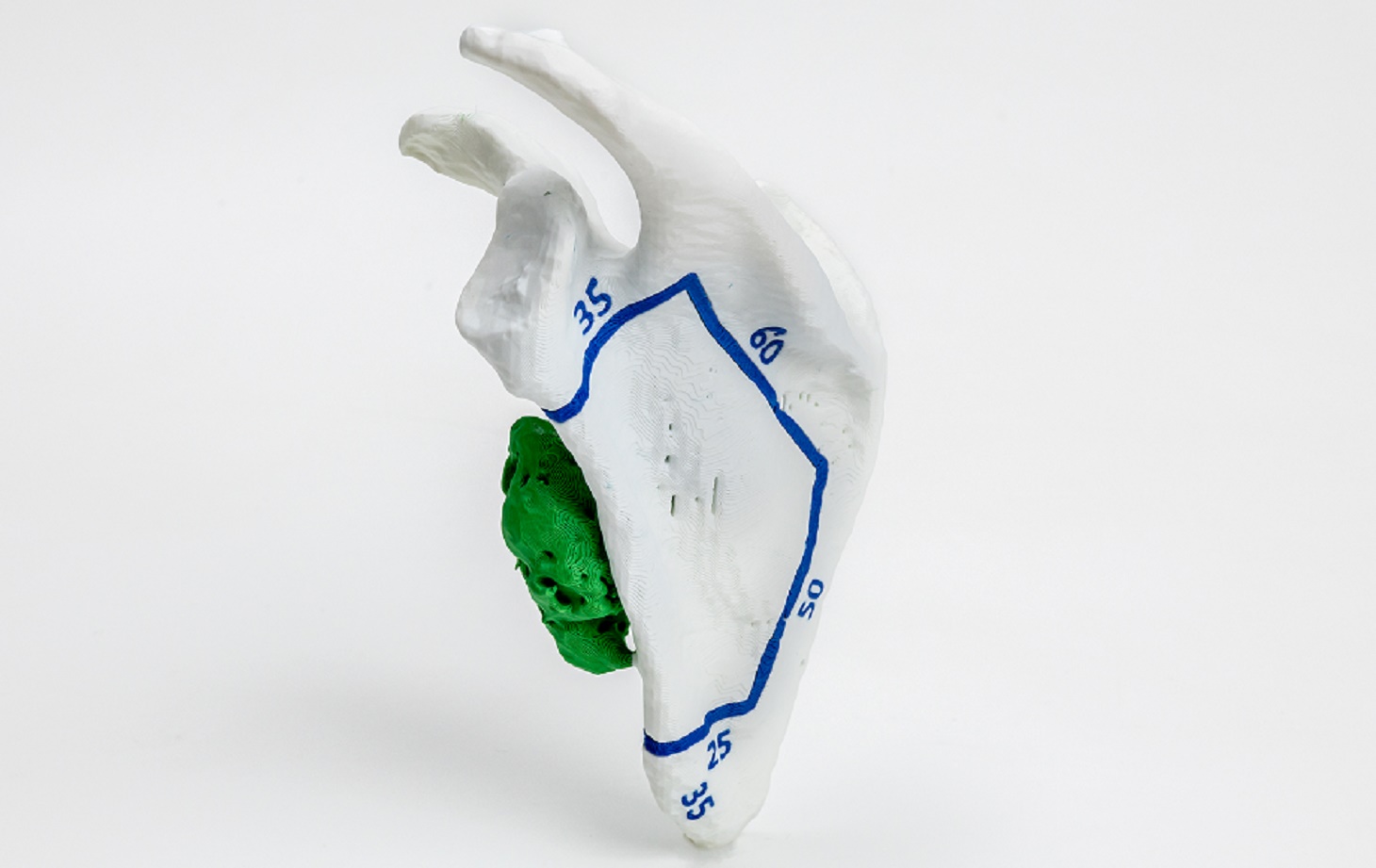 På baggrund af billeddiagnostik 3D-printes en patientspecifik model af scapula med tumor, som understøtter præoperativ planlægning og valg af resektionsomfang og rekonstruktionsstrategi (fx alloplastik eller knogletransplantat).