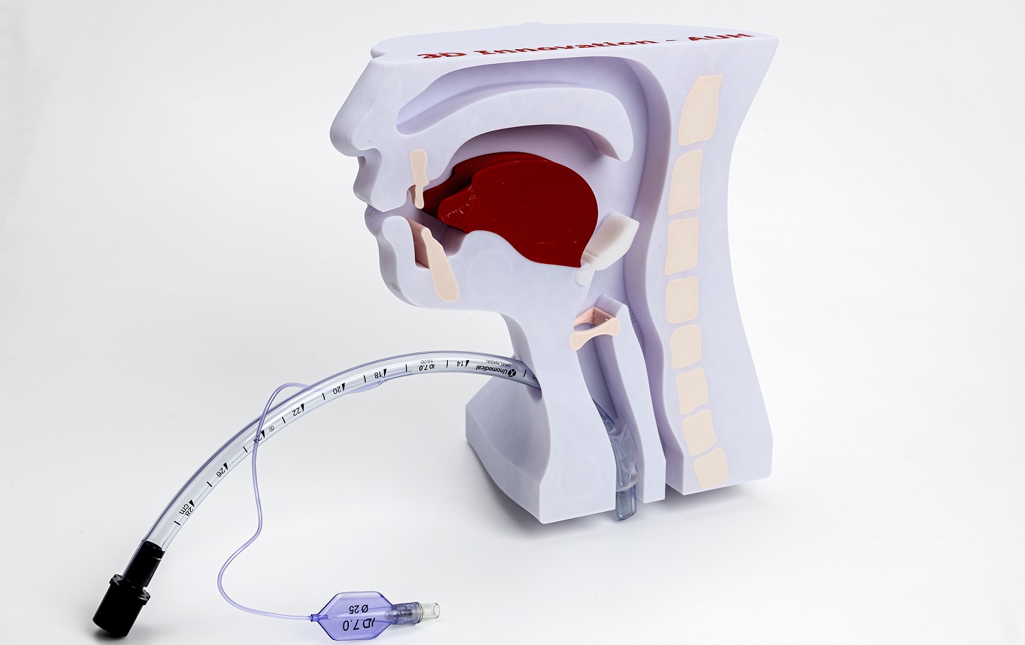 Til information og træning har vi udviklet en model af hoved og hals, der kan åbnes i to halvdele. Modellen viser tunge, strubelåg, stemmebånd og luftveje, så personalet kan gennemgå proceduren trin for trin, demonstrere anlæggelse og håndtering af kanylen og give pårørende og patienter en konkret, visuel forklaring. Modellen anvendes allerede på flere afdelinger med gode erfaringer.