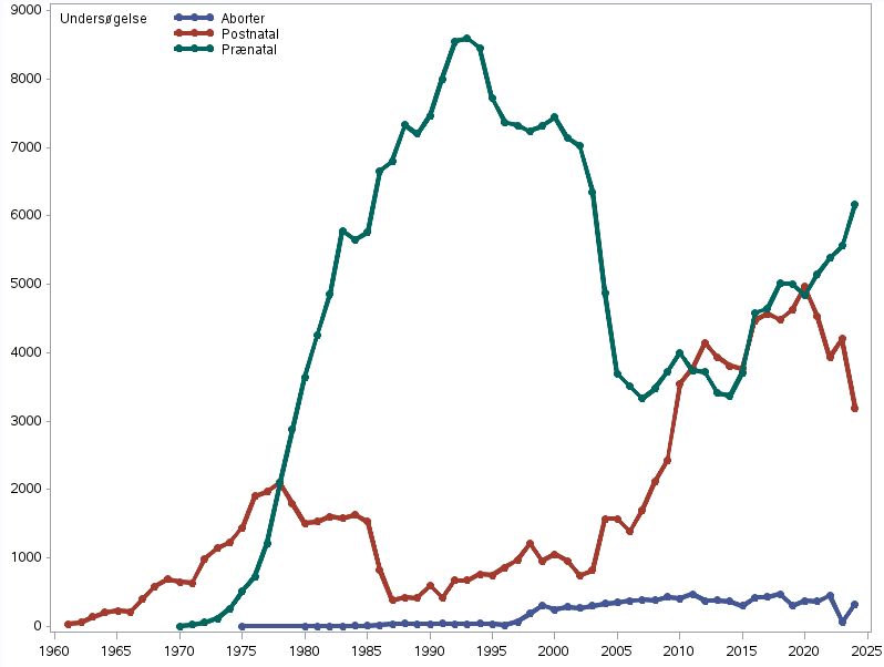 Billedet herunder viser et eksempel på nogle af de data, vi registrerer. Det er en graf over antal cytogenetiske analyser pr. år opgjort på prænatale og postnatale prøver og prøver på abortvæv.
