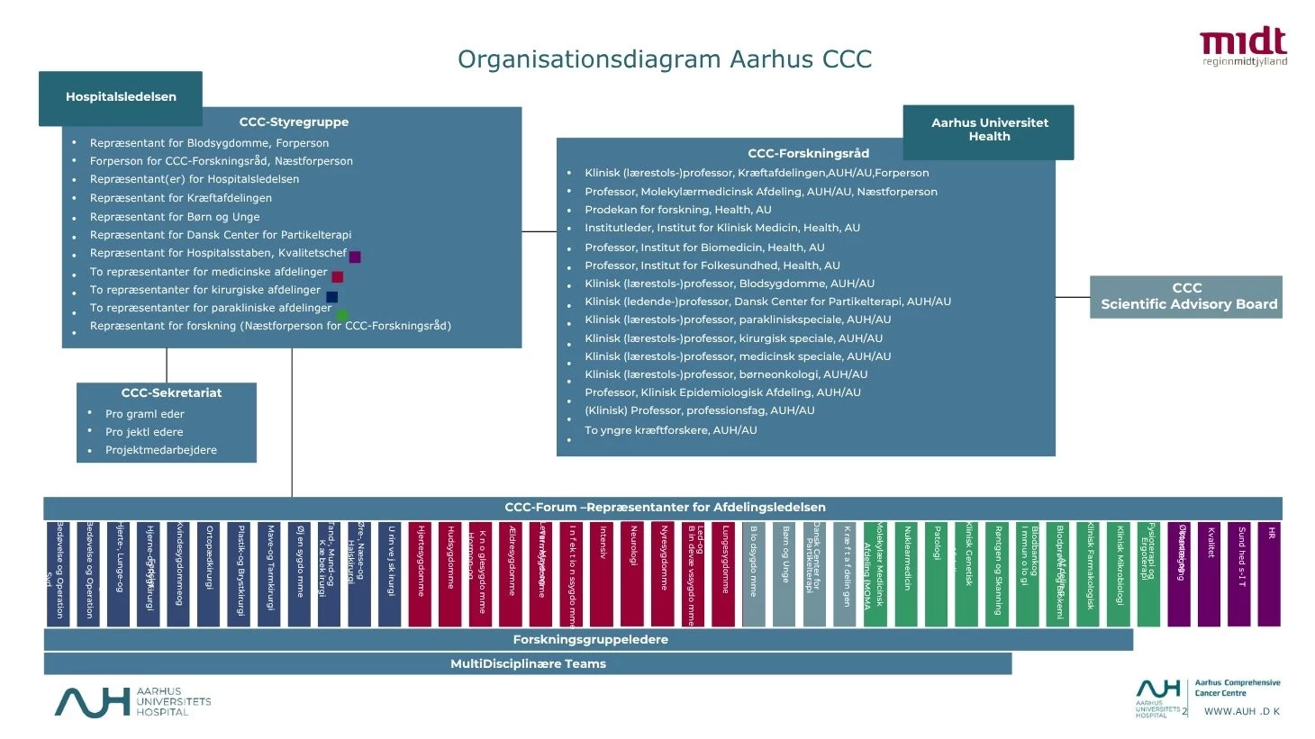 Formålet med CCC-Styregruppen er at samle beslutningskraften på tværs af hospitalet og bidrage til kontinuitet i drøftelser, beslutninger og tiltag på AUH vedrørende kræftområdet, CCC og akkreditering.