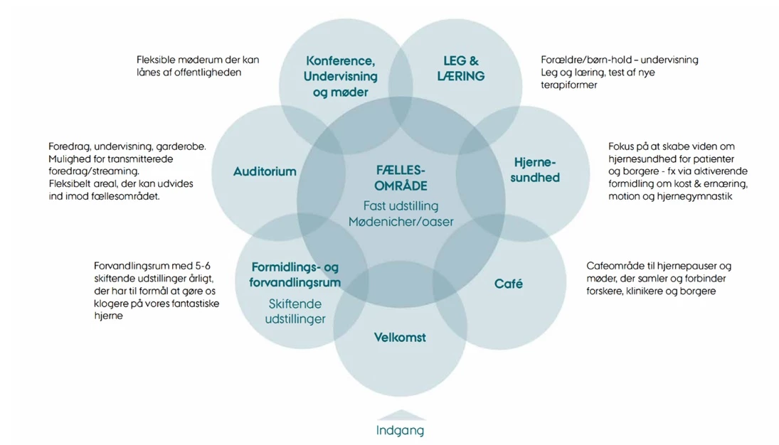 - Café: Caféområde til hjernepauser og møder, der samler og forbinder forskere, klinikere og borgere