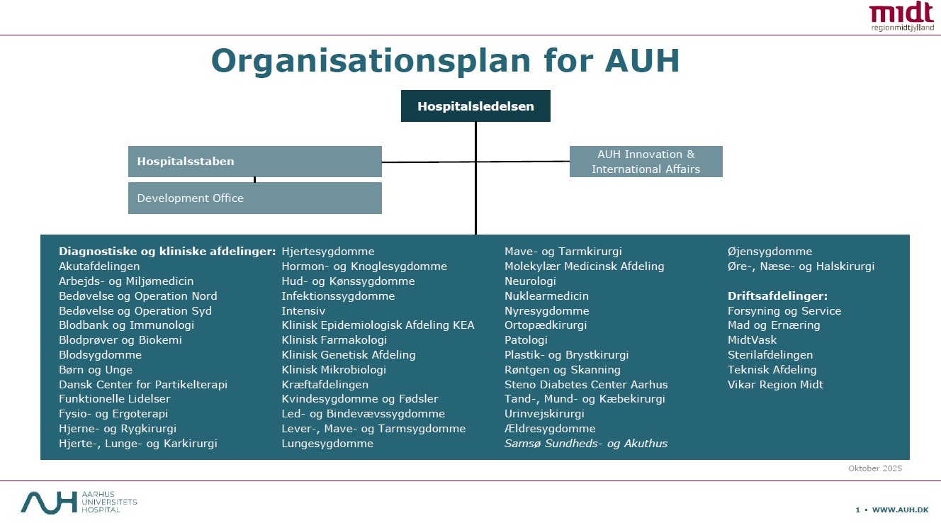 Aarhus Universitetshospital ledes af en hospitalsledelse på 5 personer, som består af 1 hospitalsdirektør, 1 direktør, 2 lægefaglige direktører og 1 sygeplejefaglig direktør.