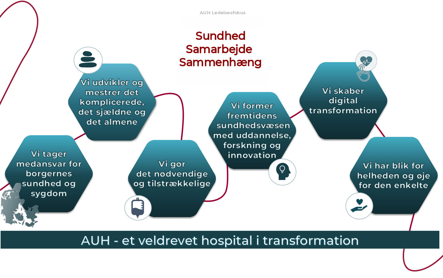 I disse år står sundhedsvæsenet og AUH over for en række komplekse udfordringer blandt andet i forhold til en aldrende befolkning og flere borgere med kroniske sygdomme. Det kræver en grundlæggende forandring af den måde, vi er hospital på for, at vi fremadrettet kan skabe mest værdi for borgerne - tættere på, hvor de er.