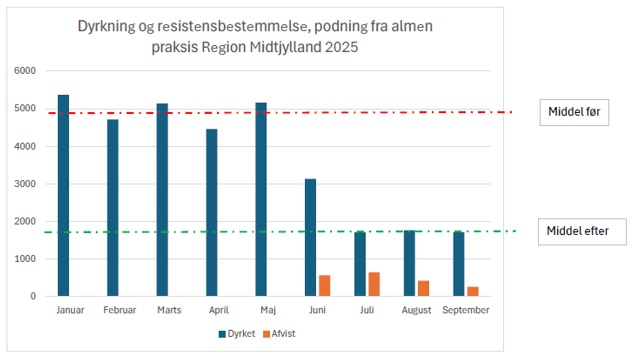 Den faldende udvikling i dyrkning af podninger fra almen praksis ses tydeligt illustreret i nedenstående graf, der også viser, at antallet af afviste prøver er aftagende. Tiltaget startede i midten af juni 2025.