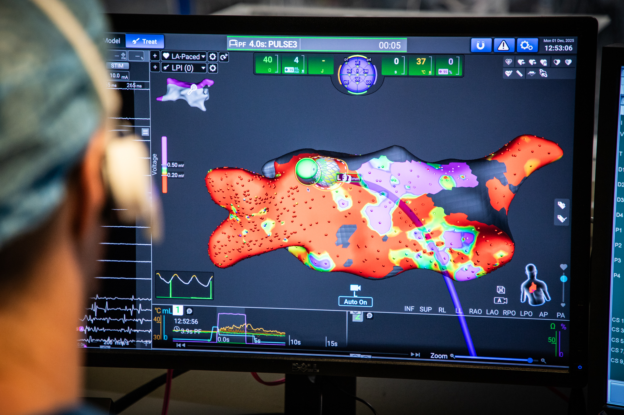 Den nye kateterteknologi med flere elektroder gør det muligt både at lave et 3D-kort af hjertet og behandle vævet med henholdsvis varme og/eller strøm med samme kateter. Lægen, der udfører indgrebet, skifter mellem funktionerne med et vip med foden.